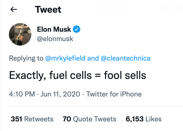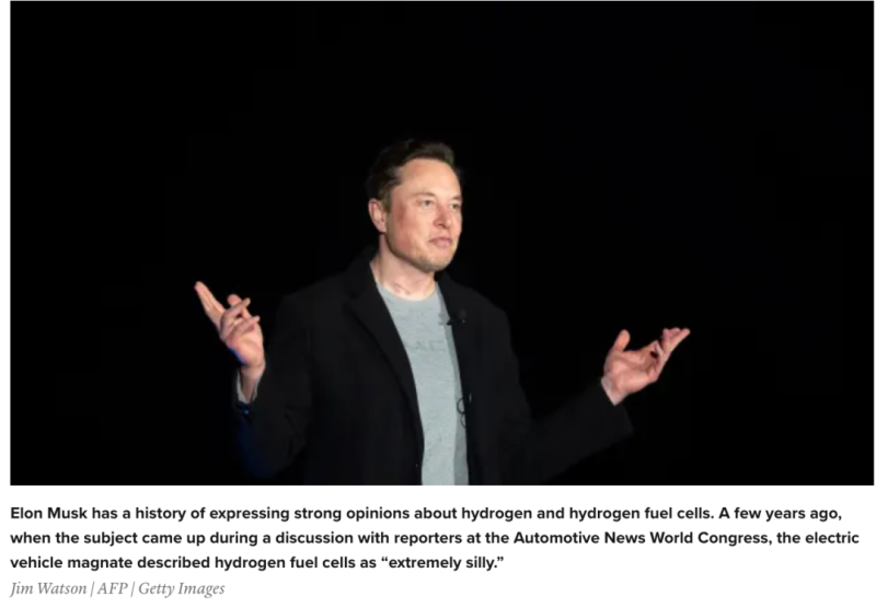 馬斯克有對(duì)氫氣和氫燃料電池發(fā)表強(qiáng)烈意見(jiàn)的歷史。幾年前,當(dāng)這個(gè)問(wèn)題在汽車(chē)新聞世界大會(huì)上與記者討論時(shí),這位電動(dòng)汽車(chē)巨頭將氫燃料電池描述為“非常愚蠢”。2020年6月,他在推特上發(fā)布了“燃料電池=傻瓜銷售”,并在當(dāng)年7月補(bǔ)充說(shuō):“氫的‘傻瓜出售’毫無(wú)意義?!?