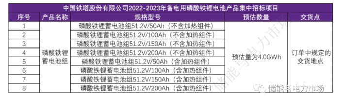 中國儲能網(wǎng)訊:5月13日,中國鐵塔股份有限公司2022-2023年備電用磷酸鐵鋰電池產(chǎn)品集中招標項目發(fā)布招標,將集中采購預估量為4.0GWh的磷酸鐵鋰電池產(chǎn)品,集中采購期1年。共將選取8個中標企業(yè),份額從22%到5%不等。