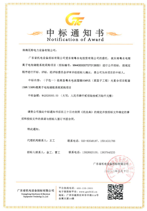 中國(guó)儲(chǔ)能網(wǎng)訊:近日,東南粵水電鋰離子電池儲(chǔ)能系統(tǒng)采購(gòu)項(xiàng)目發(fā)布中標(biāo)結(jié)果通知,瓦特電力成功中標(biāo)。此次中標(biāo)項(xiàng)目為臨高縣粵水電波蓮鎮(zhèn)60MW農(nóng)(菜籃子工程)光復(fù)合項(xiàng)目配套15MW/30MWh鋰離子電池儲(chǔ)能系統(tǒng),中標(biāo)總額4262.60萬(wàn)元。