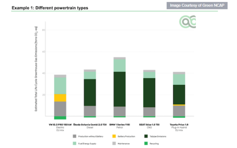 綠色NCAP研究的全部結(jié)果可以在發(fā)表的新聞中找到,然而比較質(zhì)量/尺寸和車身形狀相似但動(dòng)力系統(tǒng)不同的車輛尤為有趣。雖然電動(dòng)汽車在使用期間不會(huì)對(duì)當(dāng)?shù)禺a(chǎn)生任何排放,但生產(chǎn)電動(dòng)汽車,包括所有的電氣和電子元件以及內(nèi)部的高壓電池,預(yù)計(jì)將產(chǎn)生大量溫室氣體(GHG)。再加上在其使用壽命內(nèi)提供電能時(shí)排放的預(yù)估溫室氣體,使生命周期排放量更接近一些內(nèi)燃機(jī)(ICE)車輛。盡管如此,電動(dòng)汽車仍然顯示出最好的結(jié)果,特別是當(dāng)添加回收電子元件的好處時(shí)。