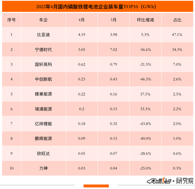 與之相反的是,比亞迪市占率大幅上升近13個百分點,其次是欣旺達提升3.5個百分點,國軒高科市占率提升1個百分點。蜂巢能源、孚能科技、瑞浦能源、多氟多、鵬輝電源市占率均有不同程度的上升。