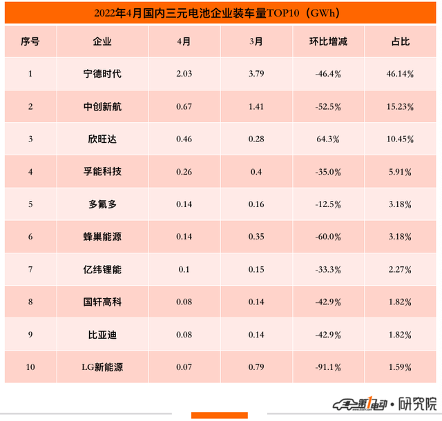 三元電池材料方面,4月寧德時代裝車量2GWh,環(huán)比下降46.5%,占比46%,位居冠軍,中創(chuàng)新航裝車量0.67GWh,環(huán)比下降52.5%,占比下降2個百分點至15.23%,位居第二,欣旺達裝機量0.46GWh,環(huán)比大漲64.3%,占比提升近7個百分點至10.45%,排名提升3個名次至第三。
