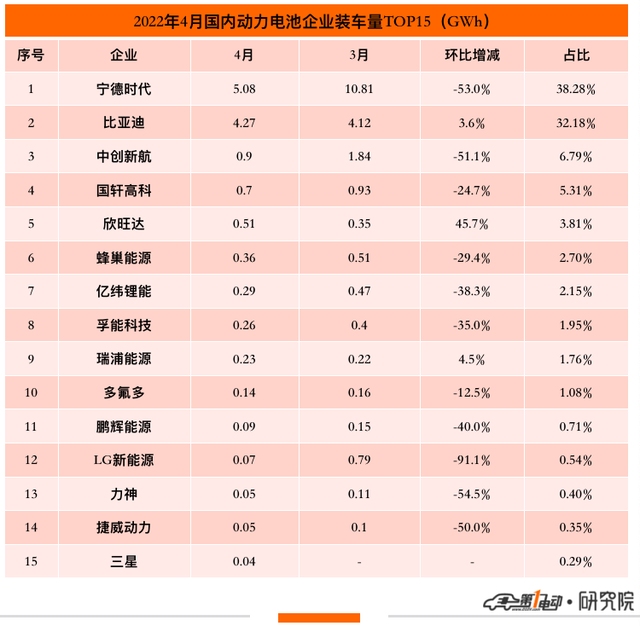最重要的變化是,寧德時代市占率嚴重下滑,從3月(50%)下降十二個百分點至4月38%,而比亞迪逆勢大漲,市占率從3月(19.24%)提升近十三個百分點至32.18%。