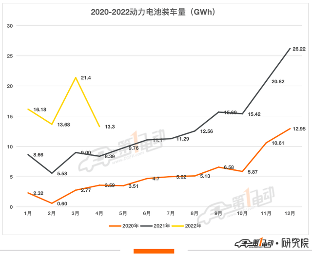 根據(jù)中國汽車動力電池產(chǎn)業(yè)創(chuàng)新聯(lián)盟(簡稱“電池聯(lián)盟”)發(fā)布的數(shù)據(jù),4月,我國動力電池裝車量13.3GWh,同比增長58.1%,環(huán)比下降38.0%。1-4月,我國動力電池累計裝車量64.5GWh, 累計同比增長104.1%。