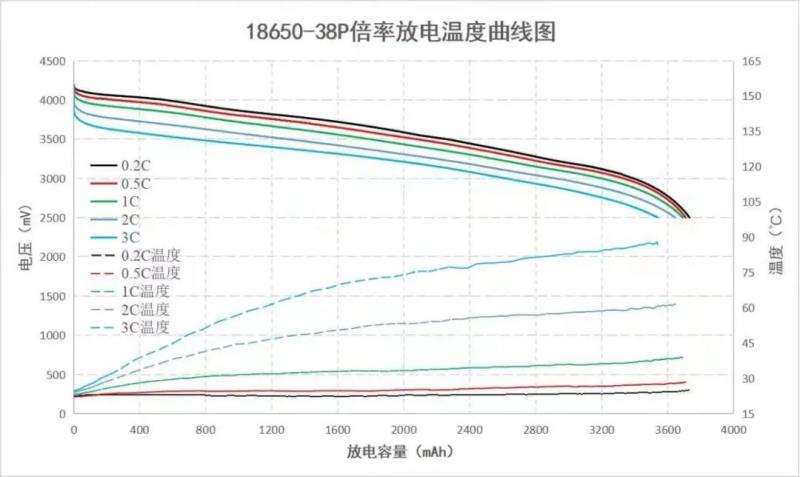 猛獅科技18650-38P動(dòng)力電芯在不同放電倍率下的溫度曲線