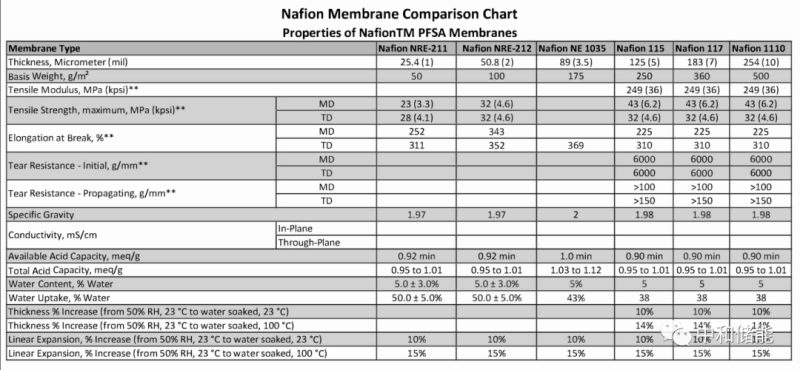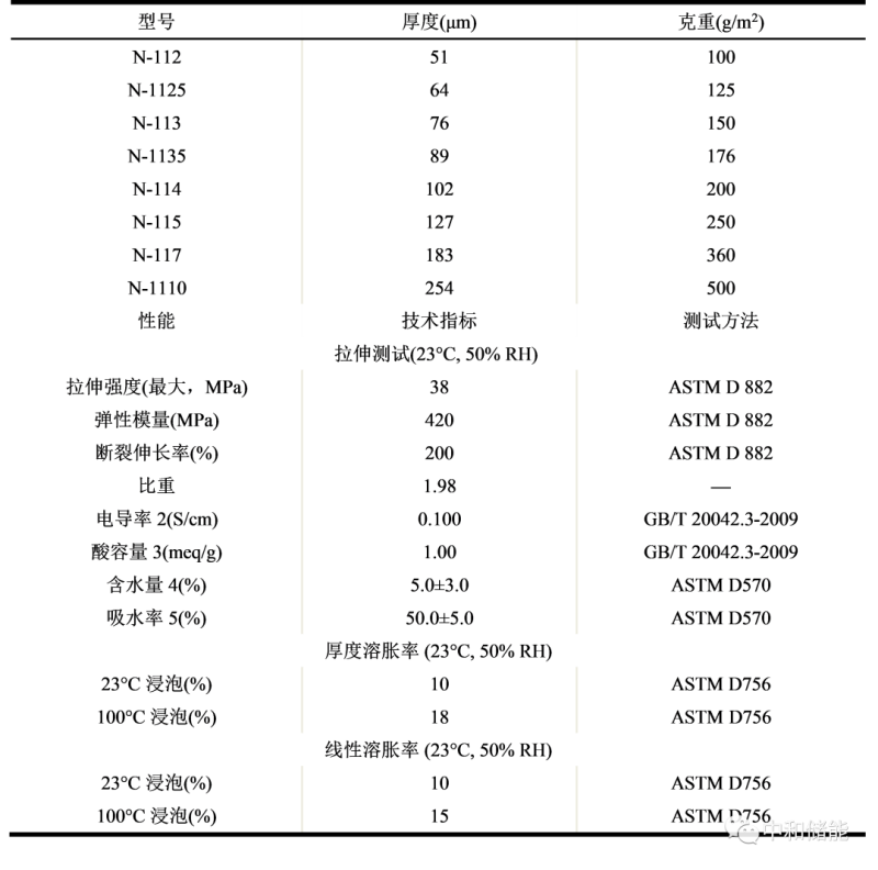以美國杜邦公司生產(chǎn)的全氟磺酸質(zhì)子交換膜Nafion?系列膜(Nafion? 112、Nafion? 115、Nafion? 117等)為例,在中國售賣的產(chǎn)品N115和N117,其少量零售價分別為13500元/平方米和15000-19000元/平方米,批量售價也在2000-3000元/平方米。據(jù)其公開資料顯示,Nafion全氟磺酸 (PFSA) 膜是PFSA/聚四氟乙烯 (PTFE) 共聚物膜,其用于儲能方面的膜主要包括采用流延法生產(chǎn)的具有高穩(wěn)定性的NR211和NR212,其厚度分別為25.4微米和50.8微米,以及擠出法生產(chǎn)的高穩(wěn)定性的N115和N117,其厚度分別為125微米和183微米,其主要性能如下所示。在表中顯示的相關(guān)產(chǎn)品性能,NR211、NR212、N115、N117的機械方向(MD)拉伸強度分別為23MPa,32MPa,43MPa和43MPa,隨著厚度提升其拉伸強度隨之提升。相關(guān)文獻報道目前其主要電導(dǎo)率參數(shù)N117為0.035 S cm?1,其它Nafion的性能也在0.05-0.07 S cm?1左右,隨厚度減小而逐漸電導(dǎo)率增加。