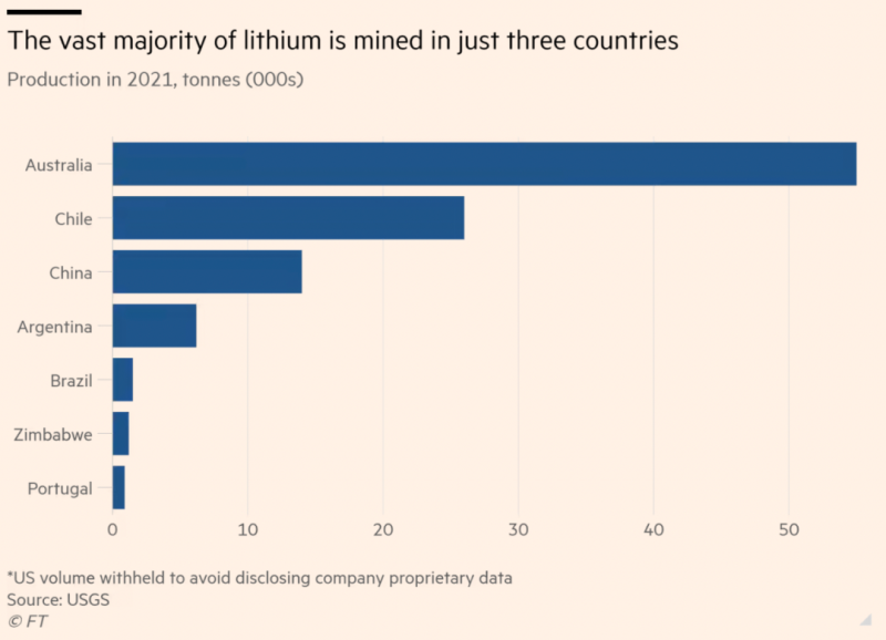 國際能源署表示,全球80%以上的鋰礦產(chǎn)自澳大利亞、智利和中國,僅中國就控制著全球一半以上的加工和精煉。美國在內(nèi)華達(dá)州有一座露天鋰礦,其他大部分供應(yīng)來自阿根廷和智利。