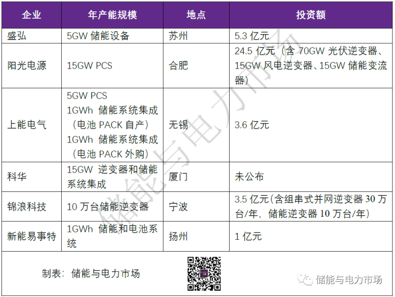 根據(jù)儲能與電力市場對主要逆變器企業(yè)擴產(chǎn)投資動態(tài)的追蹤,目前陽光電源、上能、科華、盛弘、錦浪等企業(yè)的儲能業(yè)務(wù)擴產(chǎn)規(guī)模已經(jīng)超過40GW,涉及儲能PCS、儲能和電池系統(tǒng)集成、戶用儲能產(chǎn)品等多個領(lǐng)域。