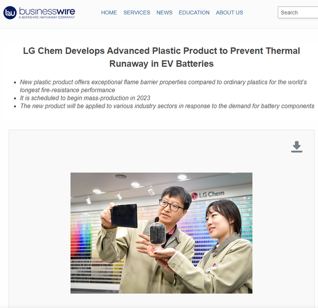中國(guó)儲(chǔ)能網(wǎng)訊:5 月 16 日消息,近期 LG 化學(xué)公司表示,已經(jīng)開發(fā)出一種高度耐熱的塑料,可以大大延遲電動(dòng)汽車(EV)所用的鋰離子電池的熱失控。