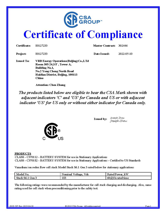 CSA集團(tuán)中國(guó)區(qū)副總裁葛延青女士說(shuō),“CSA集團(tuán)對(duì)北京普能第三代電堆產(chǎn)品獲得ANSI/CAN/UL 1973認(rèn)證證書(shū)表示祝賀。普能產(chǎn)品獲得認(rèn)證,標(biāo)志著其全釩液流技術(shù)的核心電堆在安全性方面的優(yōu)異表現(xiàn)。我們希望北京普能通過(guò)獲得像CSA這樣權(quán)威機(jī)構(gòu)對(duì)其產(chǎn)品的認(rèn)證,可以讓國(guó)內(nèi)外客戶更有信心選擇其全釩液流儲(chǔ)能產(chǎn)品”。