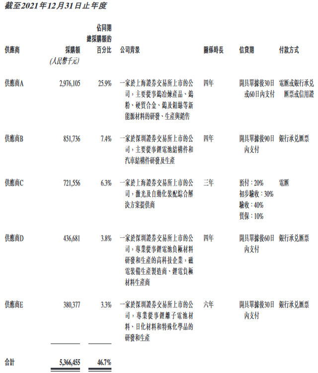截至2019年、2020年及2021年12月31日止年度,中創(chuàng)新航向前五大供貨商的采購(gòu)額分別為人民幣23.114億元、15.768百萬(wàn)元及53.665億元,約占同期總采購(gòu)額的66.3%、45.3%及46.7%。同期內(nèi),中創(chuàng)新航向最大供貨商的采購(gòu)額分別為9.136億元、6.340億元及29.761億元,分別約占同期總采購(gòu)額的26.2%、18.2%及25.9%。