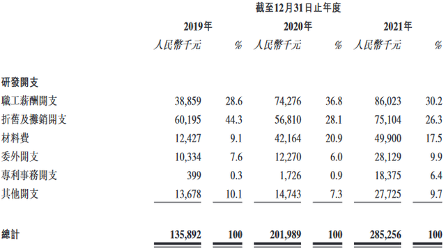 2019年至2021年,中創(chuàng)新航研發(fā)開(kāi)支中,職工薪酬開(kāi)支分別為3885.9萬(wàn)元、7427.6萬(wàn)元和8602.3萬(wàn)元,占研發(fā)開(kāi)支的比例分別為28.6%、36.8%和30.2%;折舊及攤銷(xiāo)開(kāi)支分別為6019.5萬(wàn)元、5681.0萬(wàn)元和7510.4萬(wàn)元,占研發(fā)開(kāi)支的比例分別為44.3%、28.1%和26.3%;材料費(fèi)分別為1242.7萬(wàn)元、4216.4萬(wàn)元、4990.0萬(wàn)元,占研發(fā)開(kāi)支的比例分別為9.1%、20.9%和17.5%。