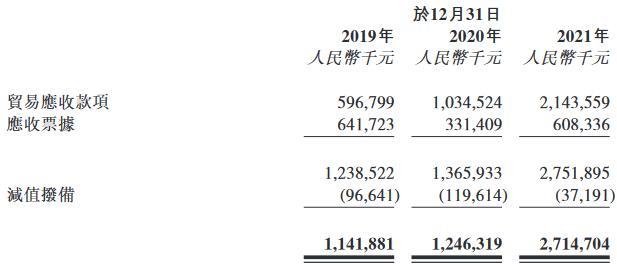 截至2019年、2020年及2021年12月31日止年度,中創(chuàng)新航貿(mào)易應(yīng)收款項(xiàng)分別為5.97億元、10.35億元和21.44億元,應(yīng)收票據(jù)分別為6.42億元、3.31億元和6.08億元,合計(jì)金額分別為11.42億元、12.46億元和27.15億元。