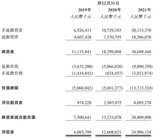 于2019 年、2020 年及2021年12月31日,中創(chuàng)新航分別錄得凈資產(chǎn)60.658億元、126.086億元及249.861億元。