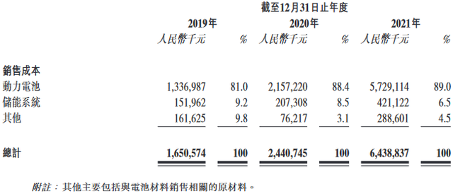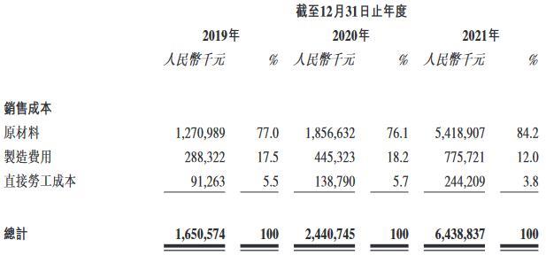 按性質(zhì)劃分,截至2019年、2020年及2021年12月31日止年度,中創(chuàng)新航原材料成本分別為12.71億元、18.57億元和54.19億元,占銷(xiāo)售成本總額的比例分別為77.0%、76.1%和84.2%;制造費(fèi)用分別為2.88億元、4.45億元和7.76億元,占銷(xiāo)售成本總額的比例分別為17.5%、18.2%和12.0%;直接勞工成本分別為9126.3萬(wàn)元、1.39億元和2.44億元,占銷(xiāo)售成本總額的比例分別為5.5%、5.7%和3.8%。