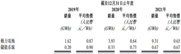 截至2019年、2020年及2021年12月31日止年度,中創(chuàng)新航動(dòng)力電池銷(xiāo)量分別為1.62 GWh、3.93 GWh和9.31 GWh,平均售價(jià)分別為0.87元/Wh、0.64 GWh和0.65 GWh;儲(chǔ)能系統(tǒng)銷(xiāo)量分別為0.20 GWh、0.33 GWh和0.67 GWh,平均售價(jià)分別為0.90元/Wh、0.73元/Wh和0.67元/Wh。