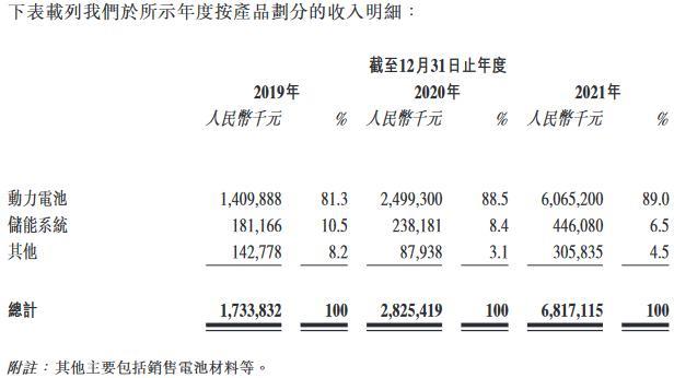 按產(chǎn)品劃分,截至2019年、2020年及2021年12月31日止年度,中創(chuàng)新航動(dòng)力電池實(shí)現(xiàn)銷(xiāo)售收入分別為14.10億元、24.99億元和60.65億元,占營(yíng)業(yè)收入的比例分別為81.3%、88.5%和89.0%;儲(chǔ)能系統(tǒng)實(shí)現(xiàn)銷(xiāo)售收入分別為1.81億元、2.38億元和4.46億元,占營(yíng)業(yè)收入的比例分別為10.5%、8.4%和6.5%;其他產(chǎn)品實(shí)現(xiàn)銷(xiāo)售收入分別為1.43億元、8793.8萬(wàn)元和3.06億元,占營(yíng)業(yè)收入的比例分別為8.2%、3.1%和4.5%。