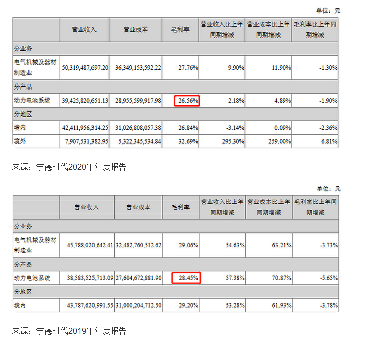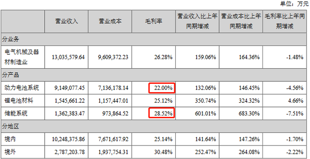 經(jīng)中國(guó)經(jīng)濟(jì)網(wǎng)記者查詢(xún),2019年至2021年,寧德時(shí)代動(dòng)力電池系統(tǒng)毛利率分別為28.45%、26.56%和22.00%。2021年,寧德時(shí)代儲(chǔ)能系統(tǒng)毛利率為28.52%。