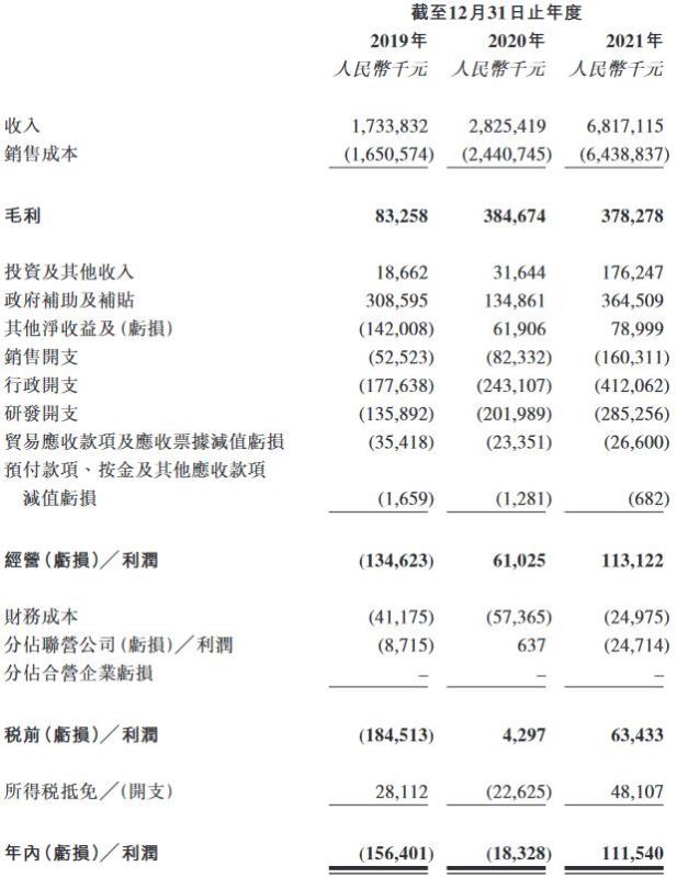 中創(chuàng)新航于2021年扭虧。截至2019年、2020年及2021年12月31日止年度,該公司實(shí)現(xiàn)利潤(rùn)分別為-1.56億元、-1832.8萬(wàn)元和1.12億元。