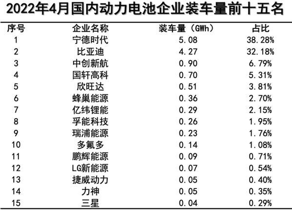 據(jù)中國(guó)汽車(chē)動(dòng)力電池產(chǎn)業(yè)創(chuàng)新聯(lián)盟發(fā)布的2022年4月動(dòng)力電池月度數(shù)據(jù),4月份國(guó)內(nèi)動(dòng)力電池裝機(jī)量前三名的企業(yè)分別為寧德時(shí)代、比亞迪、中創(chuàng)新航、國(guó)軒高科和欣旺達(dá),裝車(chē)量分別為5.08GWh、4.27 GWh、0.90 GWh、0.70 GWh和0.51 GWh,占比分別為38.28%、32.18%、6.79%、5.31%和3.81%。