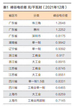 2021年7月,國家發(fā)展改革委發(fā)布《關(guān)于進一步完善分時電價機制的通知》,全國各省(市)按照要求,均制定了“分時峰谷電價”。從表1中可知,各地一般工商業(yè)用電的峰谷電價差,少的每千瓦時0.6元,多的每千瓦時1.2元。由此可見,儲能蓄能設(shè)施具有較大的套利空間。