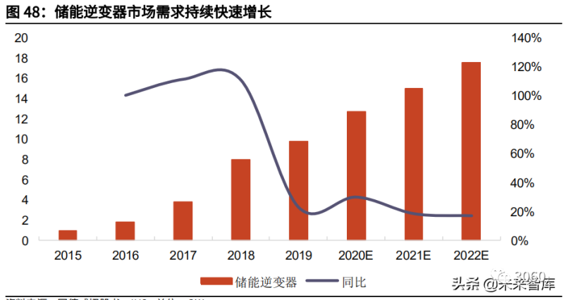 儲(chǔ)能逆變器市場(chǎng)需求持續(xù)快速增長(zhǎng)。根據(jù) IHS Markit 發(fā)布的全球市場(chǎng)研究報(bào)告, 到 2022 年,儲(chǔ)能逆變器規(guī)模將增至 17GW。2018 年-2022 年全球儲(chǔ)能逆變器累 計(jì)市場(chǎng)規(guī)模預(yù)計(jì)為 63GW,呈持續(xù)增長(zhǎng)態(tài)勢(shì)。