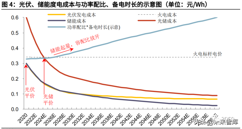 根據(jù) Solarzoom,風(fēng)光電力要“100%增量替代”化石能源發(fā)電,要做到發(fā)電裝 機(jī)保有量:儲(chǔ)能裝機(jī)保有量≈1W:1-2Wh 的比例。我們預(yù)計(jì)在這一階段功率配 比 50%-100%,備電時(shí)長(zhǎng) 2-4h。