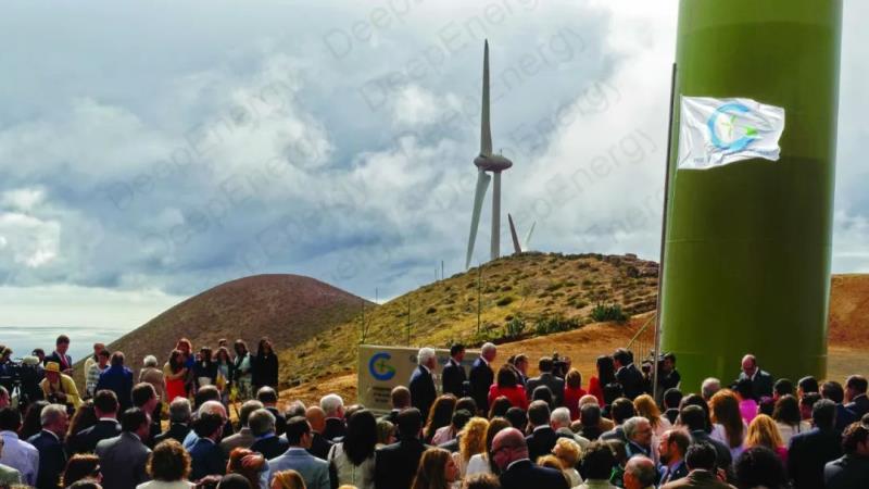 Gorona del Viento管理的EI Hierro項(xiàng)目是一個(gè)風(fēng)電水電電廠項(xiàng)目,位于EIHierro島上。這也是其運(yùn)營(yíng)的第一個(gè)類似項(xiàng)目,見(jiàn)圖5。該島嶼嚴(yán)重依賴傳統(tǒng)的柴油發(fā)電,現(xiàn)在已經(jīng)成功轉(zhuǎn)型到完全采用可再生能源系統(tǒng)。項(xiàng)目的目標(biāo)是為島上所有居民提供100%可再生能源(Garcia Latorre,Quintana and de la Nuez,2019)。項(xiàng)目建于2014年,風(fēng)水發(fā)電系統(tǒng)主要包括了:一個(gè)高海拔蓄水池、一個(gè)低海拔蓄水池、一個(gè)風(fēng)電場(chǎng)和一個(gè)水電站。高海拔蓄水池位于島上火山盆地的最高處,總?cè)莘e是380000m3。低海拔蓄水池位于水電站旁邊,總?cè)莘e是150000m3。風(fēng)電場(chǎng)包括5個(gè)2.3MW風(fēng)力發(fā)電機(jī)組,總裝機(jī)11.5MW。水電站包括4個(gè)2.83MW沖擊式水輪發(fā)電機(jī)組,總裝機(jī)11.32MW。除了向島上供電外,風(fēng)力發(fā)電機(jī)組還向一些抽水蓄能電站的高處蓄水提供電力。高海拔蓄水池里的水通過(guò)重力自流的方式流向低處,推動(dòng)水力發(fā)電機(jī)發(fā)電,從而實(shí)現(xiàn)了蓄能。