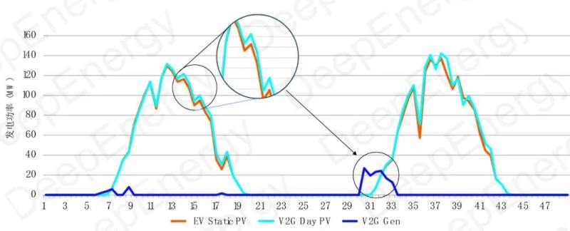在V2G(Vehicle-to-grid)系統(tǒng)中,電動(dòng)汽車通過(guò)將尖峰時(shí)段的能源轉(zhuǎn)移到晚上或早上的時(shí)段來(lái)進(jìn)行能源套利,見(jiàn)圖2。圖中顯示了電動(dòng)汽車是如何進(jìn)行能源套利的。其中,EV Static PV是指電動(dòng)汽車作為靜態(tài)負(fù)荷(即將電動(dòng)汽車作為電網(wǎng)負(fù)荷需求增長(zhǎng)的部分),V2G Gen是指從電動(dòng)汽車向電網(wǎng)的放電。圖中顯示了采用V2G之后,更多的PV發(fā)電可以被吸收并在后續(xù)使用。
