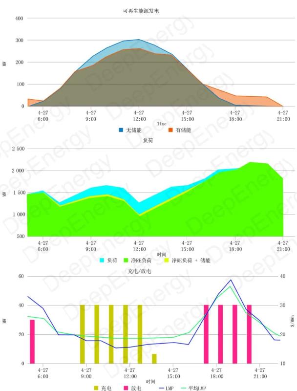 圖1中藍(lán)色區(qū)域代表無(wú)儲(chǔ)能的光伏發(fā)電輸出,橙色代表有儲(chǔ)能的光伏發(fā)電輸出。9點(diǎn)到14點(diǎn)的部分VRE發(fā)電被儲(chǔ)存起來(lái),并在16點(diǎn)到21點(diǎn)的時(shí)段使用。下面的圖片示意了充電發(fā)生在低電價(jià)時(shí)段,放電發(fā)生在高電價(jià)時(shí)段。