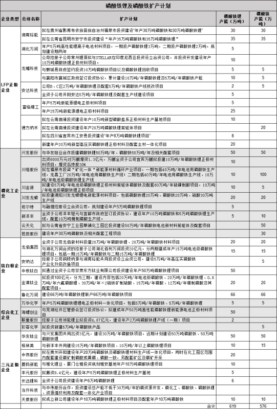 從擴產主體來看,主要分為四股勢力:一是以湖南裕能、湖北萬潤為代表的傳統(tǒng)磷酸鐵鋰正極材料企業(yè);二是以格林美、華友鈷業(yè)、中偉股份為代表的三元材料企業(yè);三是以龍佰集團、川發(fā)龍蟒、金浦鈦業(yè)為代表的磷化工以及鈦白粉企業(yè);四是萬華化學等綜合化工類型的跨界企業(yè)。