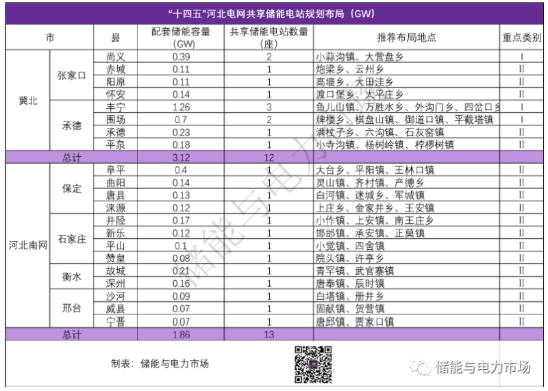 在全面調(diào)研河北實際情況后,《方案》將河北省各縣區(qū)分成了一類、二類兩類區(qū)域,一類區(qū)域可配置2-3個儲能電站,二類區(qū)域可配置1個儲能電站。