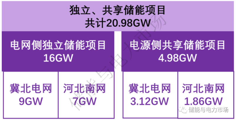 依據(jù)這兩個方案,河北省“十四五”期間將布局儲能電站共計20.98GW。其中電網(wǎng)側(cè)獨立儲能電站16GW,電源側(cè)共享儲能項目4.98GW。
