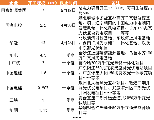 事實(shí)上,今年已開(kāi)工新能源項(xiàng)目遠(yuǎn)遠(yuǎn)不僅于此,根據(jù)國(guó)家能源局相關(guān)信息顯示,風(fēng)光大基地項(xiàng)目已開(kāi)工超84GW。地方國(guó)企例如京能、深能、贛能、晉能等均有新能源項(xiàng)目開(kāi)工,包括正泰、陽(yáng)光新能源、晶科電力以及全國(guó)各省市的整縣光伏項(xiàng)目等均已陸續(xù)開(kāi)工。