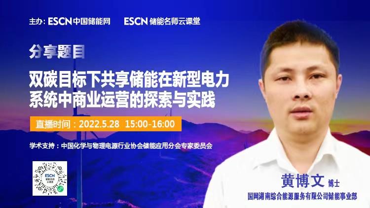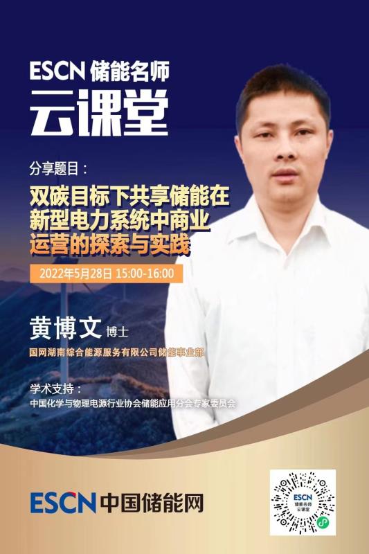 5月28日下午15:00-16:00,中國(guó)儲(chǔ)能網(wǎng)邀請(qǐng)國(guó)網(wǎng)湖南綜合能源服務(wù)有限公司儲(chǔ)能事業(yè)部黃博文博士做客“ESCN儲(chǔ)能名師云課堂”(在線直播),為大家分享《雙碳目標(biāo)下共享儲(chǔ)能在新型電力系統(tǒng)中商業(yè)運(yùn)營(yíng)的探索與實(shí)踐》主題報(bào)告。歡迎業(yè)界同仁在線學(xué)習(xí)與交流。