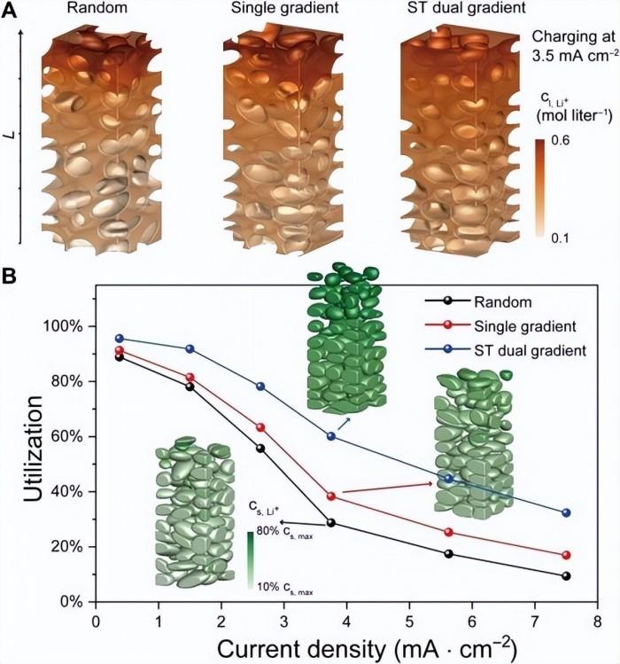“我們將這種結(jié)構(gòu)稱之為雙梯度電極。”盧磊磊說,模擬計算結(jié)果表明,在大電流密度充電條件下,這種新結(jié)構(gòu)相對于傳統(tǒng)的隨機(jī)均質(zhì)電極以及單梯度電極,展現(xiàn)出了優(yōu)異的快充性能。