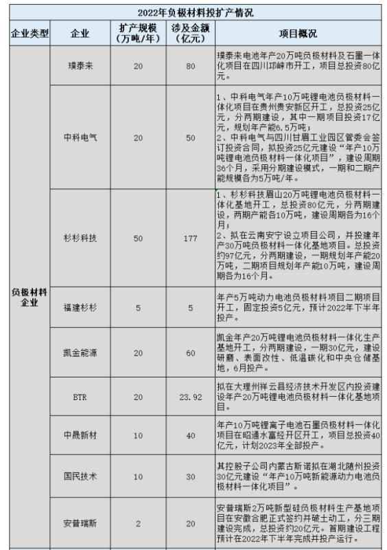 從參與主體看,主要有三類企業(yè)進軍負極材料領域。一是包括杉杉科技、中科電氣、璞泰來等負極材料“老玩家”,二是包括寧德時代、億緯鋰能、比亞迪等電池企業(yè)玩家;三是包括君禾股份、石大勝華、索通發(fā)展等跨界玩家。