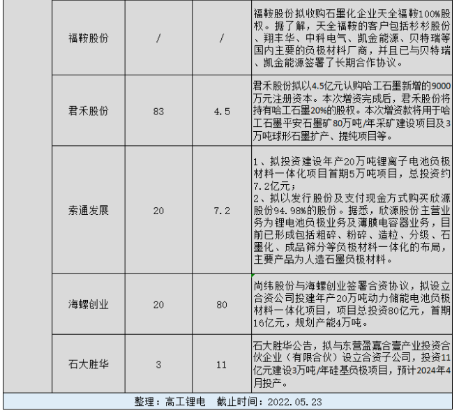 在此情境下,寧德時代、億緯鋰能等動力電池布防負極材料,有利于維穩(wěn)自身供應鏈,提高成本議價權;杉杉股份、中科電氣等負極材料相關企業(yè)加碼,則有利于提高自身生產能力,形成規(guī)?;?;索通發(fā)展、君禾股份等新玩家入局,則可打造新的業(yè)績增長曲線。