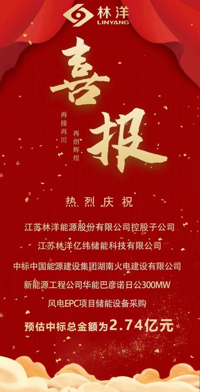 中國儲能網(wǎng)訊:5月23日晚間,林洋能源(601222.SH)發(fā)布公告,公司控股子公司江蘇林洋億緯儲能科技有限公司正式中標(biāo)中國能源建設(shè)集團(tuán)湖南火電建設(shè)有限公司新能源工程公司華能巴彥諾日公300MW風(fēng)電EPC項(xiàng)目儲能設(shè)備采購,預(yù)估中標(biāo)總金額為2.74億元。