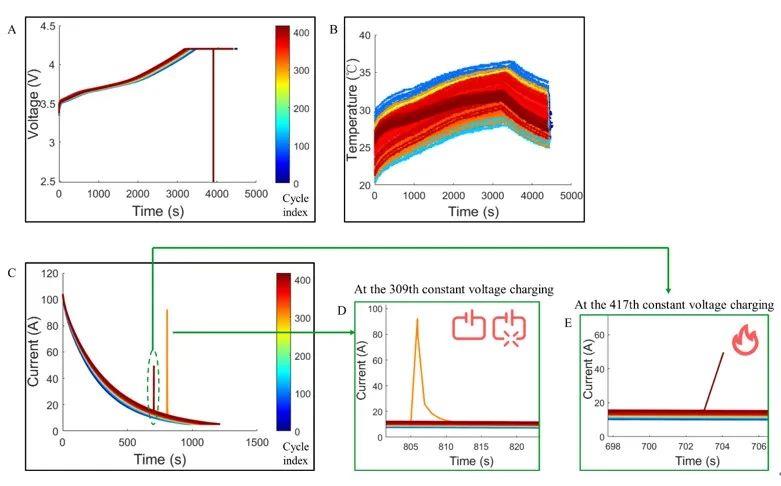 此外還發(fā)現(xiàn)有一個缺陷電池(電池C)在循環(huán)到第309圈時發(fā)生了內(nèi)短路熔斷現(xiàn)象,作者為了研究內(nèi)短路熔斷電池的安全性,讓其繼續(xù)循環(huán),該電池在第417圈時發(fā)生了突發(fā)自燃,這說明發(fā)生過內(nèi)短路熔斷的電池依然具有再次內(nèi)短路的風(fēng)險,作者也提出了電池內(nèi)短路熔斷故障篩查和預(yù)警的方法,并建議對于已經(jīng)發(fā)生過內(nèi)短路熔斷的電池需要進行報廢處理。