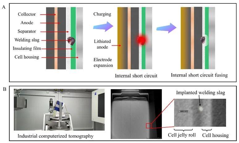 不同于以往用針刺、擠壓、過充、外短、泡水、外部加熱等濫用行為觸發(fā)的電池?zé)崾Э?,也不同于通過在電池內(nèi)部植入記憶合金、低熔點合金、石蠟等物質(zhì)(這些物質(zhì)不可能在電池實際生產(chǎn)制造過程中被混入)觸發(fā)的電池?zé)崾Э兀髡呤状螐?fù)現(xiàn)了電池在正常使用情況下自引發(fā)的突發(fā)型熱失控,更加接近于實際生活中出現(xiàn)的電池突然自燃。另外,還復(fù)現(xiàn)了電池在正常使用情況下自引發(fā)的內(nèi)短路熔斷現(xiàn)象。這項研究證明了電池內(nèi)部特殊位置的顆粒雜質(zhì)異物缺陷是引發(fā)電池突然自燃的罪魁禍首,揭示了異物缺陷引發(fā)電池內(nèi)短路和熱失控的演化過程和影響規(guī)律,提出了突然自燃的預(yù)警方法和防控方法。