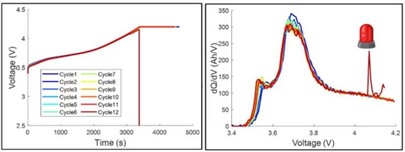 將在試制線上人為制作的缺陷電池進行了常規(guī)老化循環(huán)充放電測試實驗,測試過程中無任何熱濫用、機械濫用、電濫用等操作,其中一個異物缺陷電池(電池A)在前11圈的循環(huán)中數(shù)據(jù)無異常,但在第12圈的恒流充電階段發(fā)生了突然自燃。如圖2所示,根據(jù)數(shù)據(jù)分析發(fā)現(xiàn),根據(jù)基于傳統(tǒng)一致性(單體間電壓差異、溫度差異、SOC差異等)的診斷算法無法實現(xiàn)早期預(yù)警,作者提出了一種面向電池全生命周期的安全預(yù)警方法,不受單體間不一致性的影響,根據(jù)該次實驗結(jié)果表明可實現(xiàn)提前4分鐘的預(yù)警。