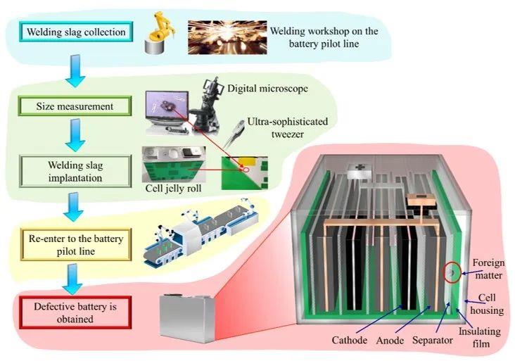 清華大學(xué)歐陽明高院士團隊與蜂巢能源科技股份有限公司多部門合作,從電池全生命周期管理角度出發(fā),對涉及電池安全的各個生產(chǎn)工序和使用環(huán)節(jié)進行全面剖析和研究,重點就可能造成電池突然自燃的顆粒雜質(zhì)異物缺陷問題(焊渣、粉塵、顆粒雜質(zhì)等,粒徑一般在幾十到幾百微米級別)展開了研究。為了研究成果能夠指導(dǎo)產(chǎn)業(yè)實際,該項研究并不是在傳統(tǒng)實驗室中進行,而是選擇了在電池試制線上,并且是大容量動力電池,而不是實驗室中常用的微型電池。如圖1所示,在電池試制線上的一個裝配工序,人為故意在一些電池半成品中分別植入不同粒徑的異物后,重新投入試制線,并監(jiān)控這些人為制作的異物缺陷電池在試制線后續(xù)的所有數(shù)據(jù)和狀態(tài)變化。通過對出現(xiàn)異常情況的電池拆解,揭示了不同粒徑大小異物對電池的影響情況和規(guī)律。