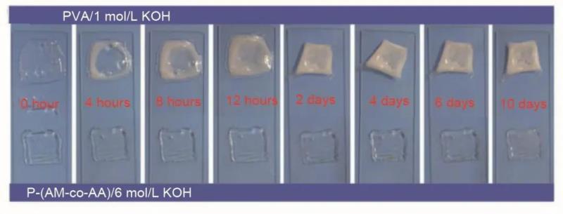更多的研究集中在使用聚合物制備固態(tài)水凝膠電解質(zhì),包括聚乙烯醇(PVA)、丙烯酸(AA)、聚乙烯吡咯烷酮(PVP)等。Zhang等人制作了全固態(tài)鋁空氣電池,凝膠電解質(zhì)采用了在AA單體中添加交聯(lián)劑N, N-亞甲基雙丙烯酰胺(MBA)和引發(fā)劑過硫酸鉀,再加入36%(質(zhì)量分?jǐn)?shù),下同)的KOH溶液制成,離子電導(dǎo)率可達到460 m S/cm。Cao等人使用丙烯酰胺(acrylamide,AM)和丙烯酸(acrylic acid,AA)單體,加入交聯(lián)劑MBA,發(fā)生聚合。將制成的聚合物薄膜浸泡在6 mol/L KOH中,最終制備成P-(AM-co-AA)/KOH凝膠電解質(zhì)薄膜。PVA凝膠在空氣中失水會變白色并且變脆,而P-(AM-co-AA)/KOH凝膠電解質(zhì)薄膜保水性良好,如圖5所示。Miao等人使用聚丙烯酰胺(PAM)為凝膠電解質(zhì)的合成材料制備固態(tài)電解質(zhì),PAM固態(tài)電解質(zhì)較傳統(tǒng)的PVA和PAA凝膠電解質(zhì)表現(xiàn)出更好的離子電導(dǎo)率,也同樣具備良好的力學(xué)性能。3 g AM和20% KOH制備的凝膠電解質(zhì)離子電導(dǎo)率能達到0.2156 S/cm。PEO/PVA凝膠膜離子電導(dǎo)率隨著溫度升高而增大,通過改變溫度可以控制凝膠電解質(zhì)離子電導(dǎo)率;也可通過降低聚合物的結(jié)晶度提高其離子電導(dǎo)率,Deghiedy等人通過向PVA/PVP共混物增加PVP濃度來降低聚合物的結(jié)晶性,增強其滲透性和黏附性能。聚合物共混物表現(xiàn)出比單個成分更好的力學(xué)性能。通過多種聚合物的協(xié)同作用減小聚合物結(jié)晶度,通過加入玻璃纖維增強其力學(xué)性能和框架結(jié)構(gòu)是目前提高凝膠電解質(zhì)離子電導(dǎo)率的有效途徑。表2總結(jié)了一些使用聚合物制備凝膠電解質(zhì)的研究結(jié)果??梢钥闯觯蠖嘌芯咳栽陉P(guān)注堿性凝膠電解質(zhì),酸性凝膠電解質(zhì)提及較少,仍然是較空白的領(lǐng)域。Mano等人的研究證明了聚氮-異丙基丙烯酰胺(PNIPAM)與PAA在低pH的作用下形成很強的氫鍵,使它們混合后鏈的移動性降低并起到交聯(lián)的作用。Migliardini等人和Tonia等人以黃原膠為原料,在酸性條件下制備的凝膠電解質(zhì)具備良好的離子傳導(dǎo)性,組裝成固態(tài)鋁空氣電池具有較高的容量與負極效率,因為黃原膠可以作為自腐蝕的緩蝕劑,抑制鋁枝晶的形成,但該電池不能充電,因為較強的析氫反應(yīng)消耗了電流,而高的電解質(zhì)反應(yīng)活性與高氫氣濃度有關(guān)。堿性凝膠電解質(zhì)具有更大的電化學(xué)窗口和放電電壓,但負極效率較低。