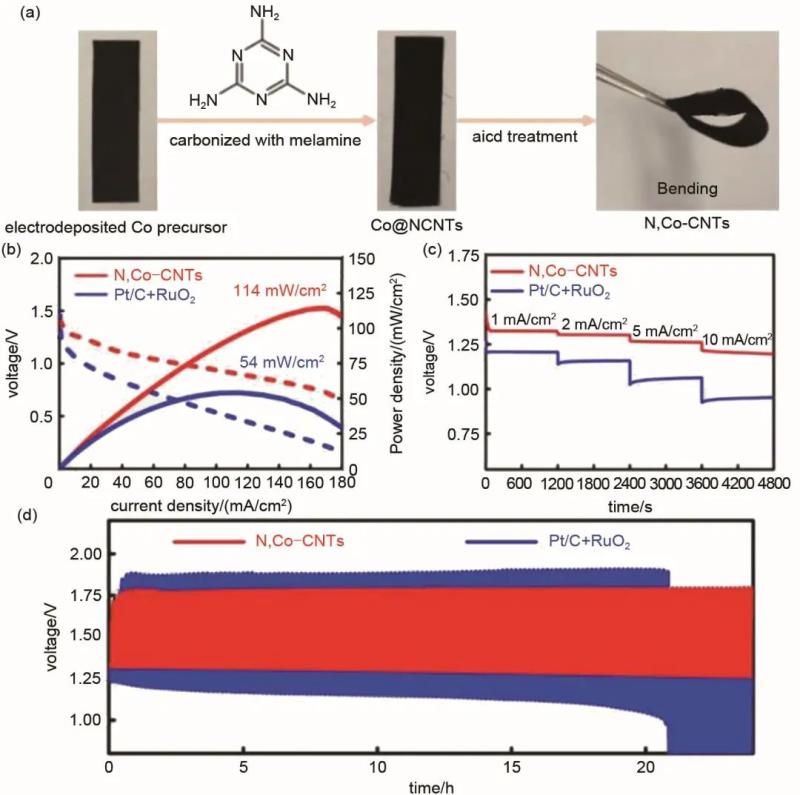 圖4 (a) 碳布上原位生長催化劑作為自支撐電極;(b) 自支撐電極與涂布商用Pt/C催化劑鋅空氣電池放電極化和對應(yīng)的功率密度曲線;(c) 不同電流密度下放電對比;(d) 充放電周期對比