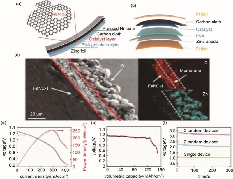 圖3 (a) 三明治結(jié)構(gòu)柔性電池示意圖;(b) 碳布上涂覆Co-CoO@NSC,組裝成的三明治層狀結(jié)構(gòu)電池;(c) 在固態(tài)電解質(zhì)兩側(cè)分別沉積催化劑和鋅粉制備固態(tài)鋅空氣電池截面圖;(d) 三合一結(jié)構(gòu)電池極化曲線和功率密度圖;(e) 8.3 mA/cm2放電曲線;(f) 單個、兩個和三個電池串聯(lián)放電圖
