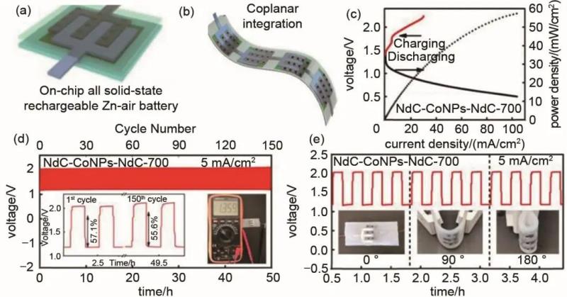圖2 (a) 單個共面結(jié)構(gòu)電池;(b) 多個共面結(jié)構(gòu)電池串聯(lián);(c) 平面型結(jié)構(gòu)電池充放電極化曲線;(d) 柔性鋅空氣電池充放電周期圖;(e) 平面型電池彎曲不同角度充放電圖