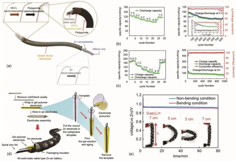 圖1 (a) 鎳鈦合金沉積MnO2催化劑作為空氣電極纏繞成線纜形柔性電池;(b) 鎳鈦合金沉積MnO2作為電極,組裝成水系鋅離子電池1 C到5 C放電圖,5 C條件下加入PPy與不加PPy充放電比容量和庫侖效率對比;(c) 鎳鈦合金沉積MnO2作為電極,組裝成線纜型柔性鋅空氣電池1 C到5 C充放電圖,2 C條件下充放電容量和庫侖效率;(d) 使用絲纖蛋白為前驅(qū)體制備柔性空氣電極,明膠為電解質(zhì),組裝電池示意圖;(e) 線纜型電池不同角度彎曲放電電壓變化圖