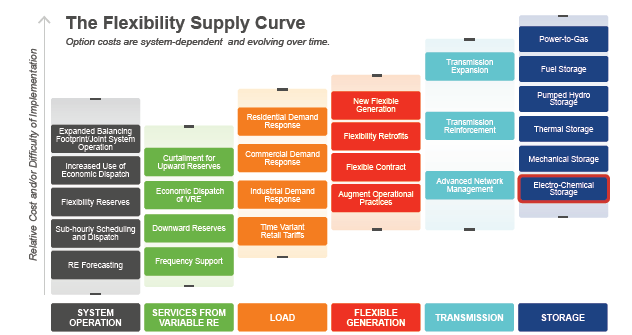 從歷史上看,儲能系統(tǒng)被視為提高電網(wǎng)靈活性的成本最昂貴的選擇之一。然而,成本下降可能會改變其在彈性供給曲線上的相對位置。盡管發(fā)生了這種轉變,但重要的是要強調儲能系統(tǒng)只是幾種資源中的一種,可以為電網(wǎng)提供靈活性,以更好地使發(fā)電供應與電力需求保持一致。