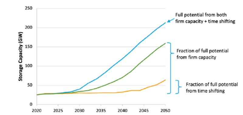 研究表明,到2050年,美國將部署約200GW的儲能系統(tǒng)。在僅提供能量時移服務時,它實現(xiàn)了其“所有四項服務”潛力的30%。但是,如果儲能系統(tǒng)僅提供固定容量而具有經濟價值,則可能部署150GW儲能系統(tǒng)。提供運營儲備服務只會相對少量地增加部署,部分原因是所需的運營儲備有限,以及主要為提供容量和時移服務而部署的儲能系統(tǒng)導致儲備需求趨于飽和。
